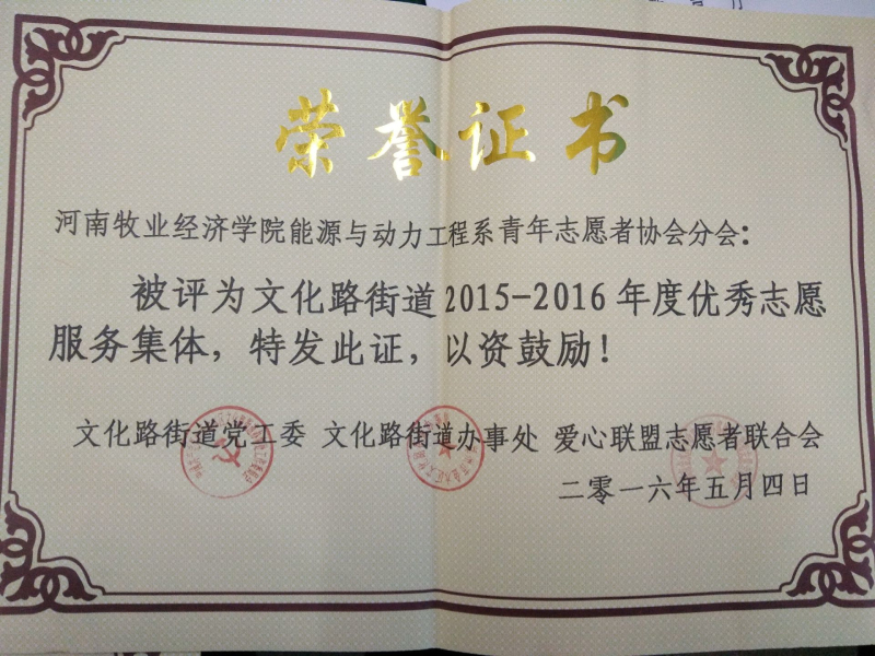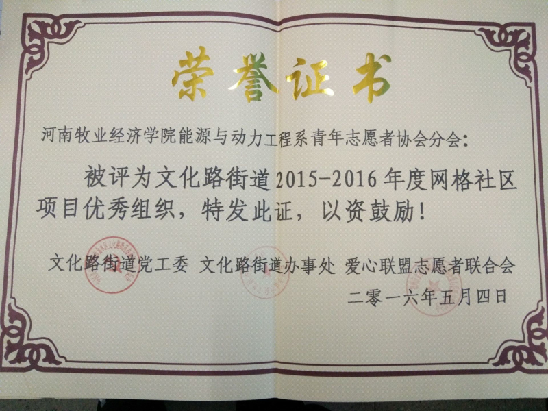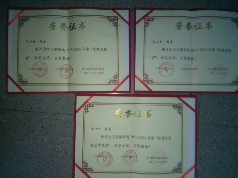 2015-2016年度优秀志愿服务集体、文化路街道2015-2016年度网格社区项目优秀组织
