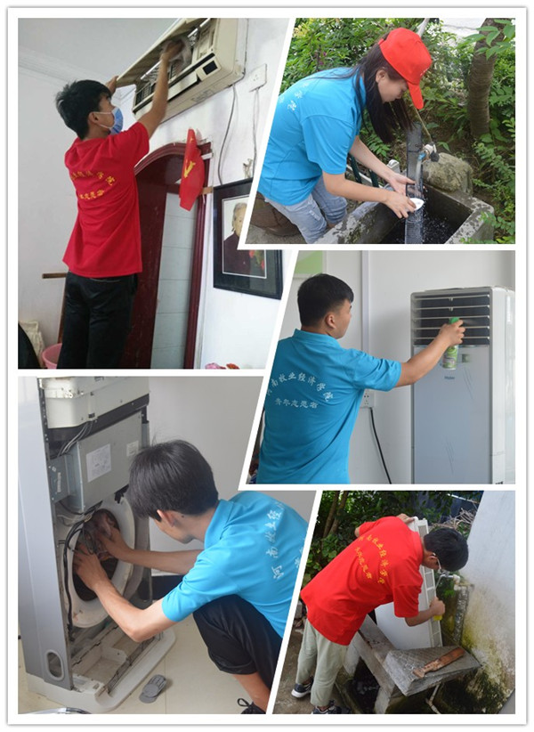 据了解,该地区群众大都并不了解空调长时间不清洗所带来的危害,缺乏清洗意识,因此队员们每到一处,都会向大家认真介绍空调积灰生菌的原因及后果,耐心讲解空调知识。清洗中,队员们做了充足的准备,软毛刷、口罩、抹布、空调清洗剂等工具一应俱全,并在简单的分工后,如火如荼的干起来。对于室内挂机,清洗比较简单,先断开电源,轻轻掀开前盖,取出两片过滤网用清水和刷子清洗晾干,再向散热片喷清洗剂杀菌消毒,然后静止几分钟后开启空调,直到观察排水口流出污水,清洗结束;对于柜式机,清洗起来比挂机稍难一些,需要使用螺丝刀将前壳去掉,滤网也比较大,队员们依然不慌不忙地完成清洗。他们熟练的动作、吃苦耐劳的干劲儿赢得了大家的一致好评,尽管汗水湿透衣衫,但队员们的心中却是清凉的,他们都为自己能够服务社会而高兴。据统计,此次活动共清洗空调60余台,受到了当地群众的赞赏和肯定。