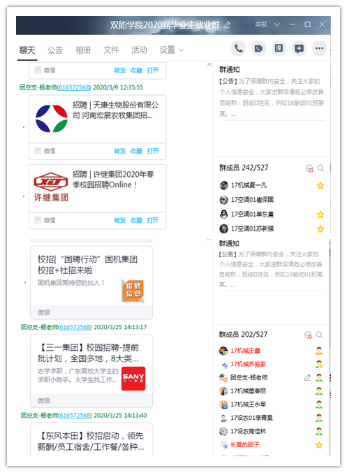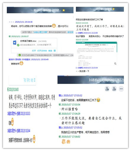 就业云服务之四—扩宽渠道,传递就业信息。各专业老师、班主任和辅导员们搜集网络招聘、考研和专升本动态等信息,在院毕业生就业群、班委群等,持续推送,为毕业生提供更多就业机会。目前,已累计推送300余条就业信息。