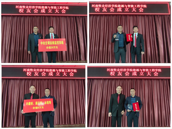 最后,由99届制冷专业毕业生,郑州科瑞空调有限公司总经理吴超杰,代表优秀员工发言,并为母校捐赠价值20万元的中央空调运维监控系统;99届制冷专业毕业生,郑州思念食品有限公司邓九为母校捐赠价值8万元的冷藏柜、展示柜、冰箱等。名誉会长隋继学、会长周凯分别为他们颁发了捐赠证书和纪念杯。