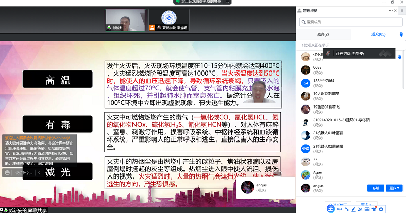 为进一步增强公司师生的消防安全意识,提升师生自护自救能力,确保师生生命财产安全。公司特开展2022年火灾警示宣传教育月活动--邀请保卫处消防科彭新安副科长为公司师生开展“关注消防,守护平安”消防安全专题讲座。此次讲座于2022年5月25日晚以线上形式开展,公司师生代表参加了此次讲座,讲座由公司党政办主任耿李姗主持。