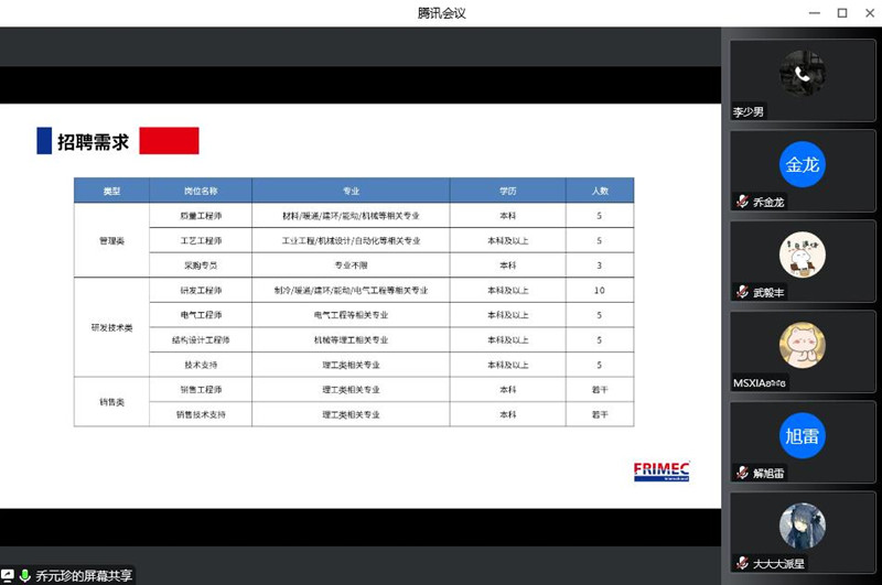 孚莱美科(江苏)环境科技有限公司,成立于2019年,位于江苏省镇江市,是一家以从事制冷设备制造业为主的企业。会议伊始,招聘人事乔元珍主任通过播放公司宣传视频、展示PPT等方式向同学们介绍了公司的历史与传承、生产车间、产品系列、公司客户、薪资体系、职业发展路径、招聘岗位专业和校园招聘流程。乔主任欢迎同学们到江苏省镇江市就业,公司将会积极协助员工落实当地人才引进政策,为员工缴纳五险一金。此外,公司有形式多样的集体活动丰富职工的业余生活,对同学们提出的各种关心事宜,乔主任做了耐心细致的解答,宣讲会在热烈的掌声中圆满结束。