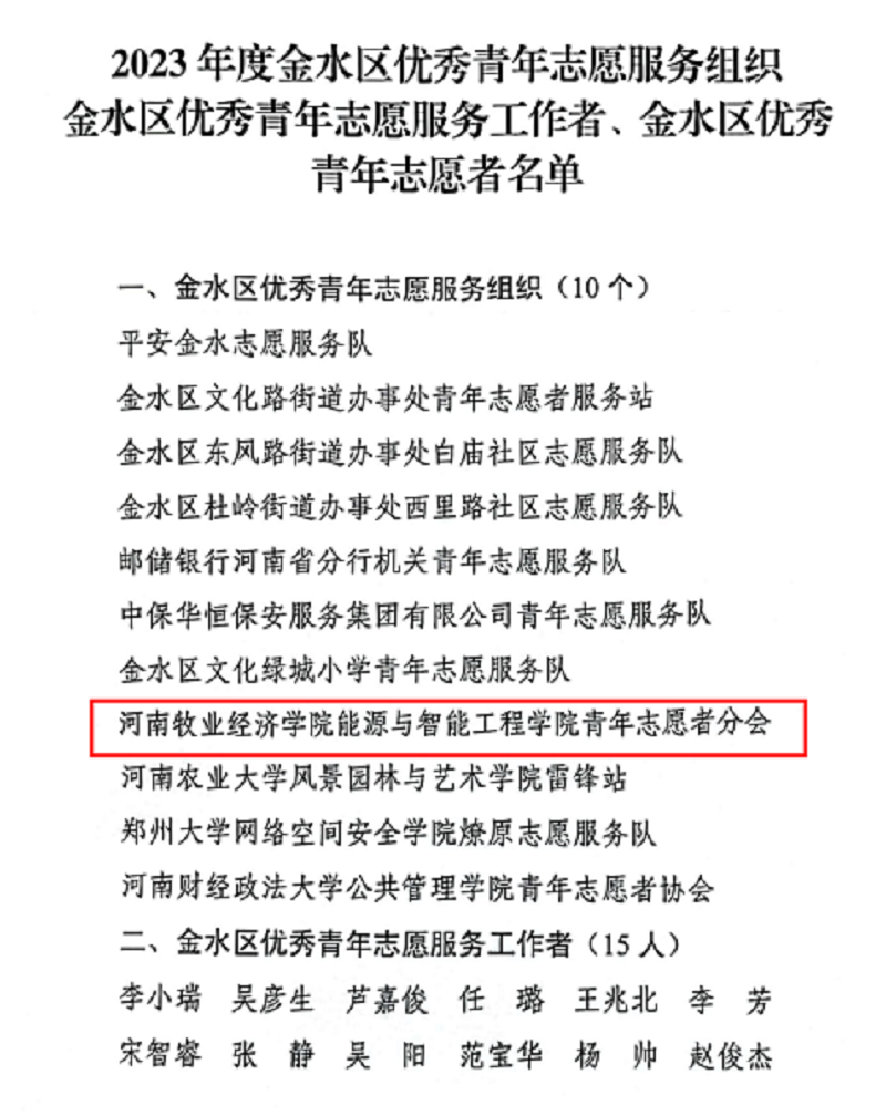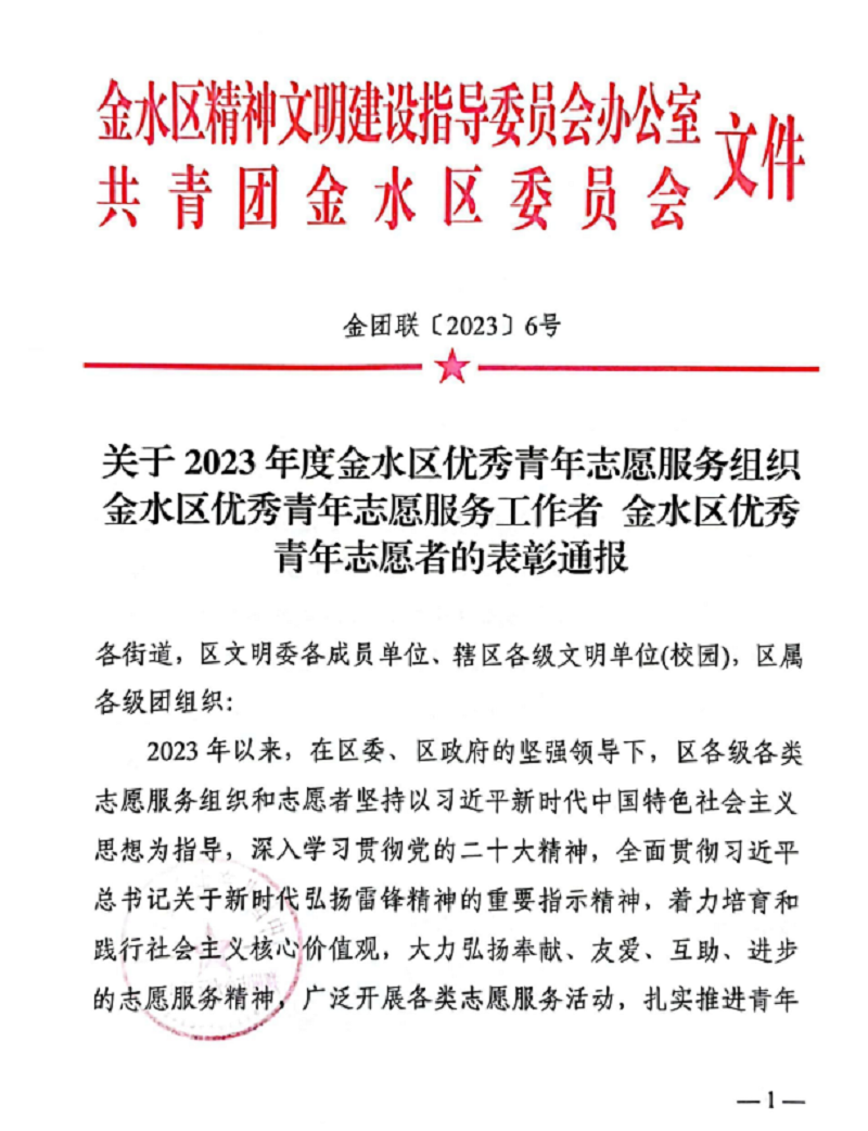近日,郑州市金水区精神文明建设指导委员会办公室、共青团金水区委员会联合颁布了《关于2023年度郑州市金水区优秀青年志愿服务组织金水区优秀青年志愿服务工作者金水区优秀青年志愿者的表彰通报》。公司青年志愿者分会荣获郑州市金水区优秀青年志愿服务组织、公司团委吴彦生老师荣获郑州市金水区优秀青年志愿服务工作者称号、21建环班谢君瑶同学荣获郑州市金水区优秀青年志愿者称号。