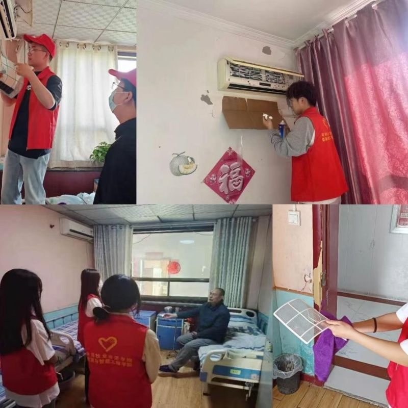 活动当天,实践队成员分组行动,率先走进留守老人家中。大家手持清洁工具,仔细打扫房间卫生,还围坐在老人身边唠家常,耐心倾听他们的生活琐事与人生故事,用温暖陪伴驱散老人们的孤独。随后,队员们怀着崇敬之情拜访退伍老兵。老兵们深情讲述峥嵘岁月里的战斗故事,从枪林弹雨的战场经历到保家卫国的坚定信念,让队员们深刻感悟革命先辈的奉献精神,接受了一场生动的爱国主义教育。在志愿服务环节,队员们充分发挥专业优势,携带专业清洗设备,逐户为居民家中的空调进行深度清洗。他们拆卸滤网、清理蒸发器、消毒外壳,不放过任何一个角落,并对空调电路进行安全检查,排除潜在隐患。同时,队员们结合专业知识,向居民普及空调日常保养知识,指导居民科学使用空调,确保设备高效节能运行。