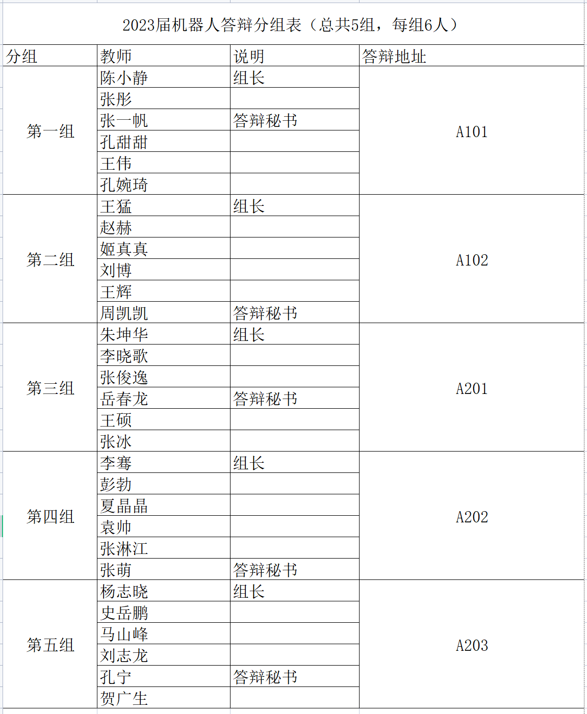 此次答辩共设5个答辩组,分组情况及答辩地点安排如下: