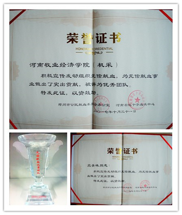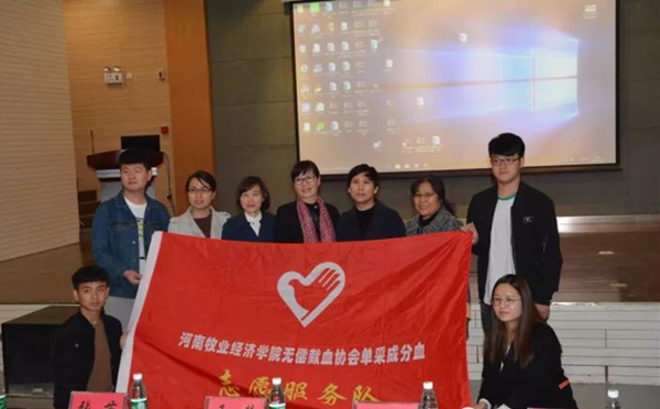 2017年11月4日,由郑州市公民献血委员会和河南省红十字血液中心共同举办的“2017年省会郑州高校无偿献血工作座谈会”在河南工业大学召开。河南省教育厅营养办主任高根立、团省委社会联络部副部长王慧、省红十字血液中心副主任李建斌、省直团工委主任科员张苗等领导出席。公司无偿献血协会受邀参加,并被授予“2017年省会高校无偿献血优秀团队奖”,党美珠老师被评为推进高校无偿献血工作优秀指导老师。