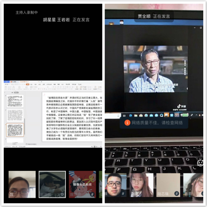 团课中,19建环01班的团支书吴文静,以宣读自己在观看思政大课的感想为开头,使人眼前一亮。19空调01班的团支书郭泽明同学为学习思政防控大课制作精美的PPT,以图文并茂的形式进行宣讲,他讲到我们要学习医护人员的敬业精神,学习军人身上的执行力,学习工人们的行动速度。在各班级团支书的精心开展下,本次团课活动圆满结束,同学们纷纷表示通过这次思政课的学习,切实能够在这段特殊经历中收获成长。