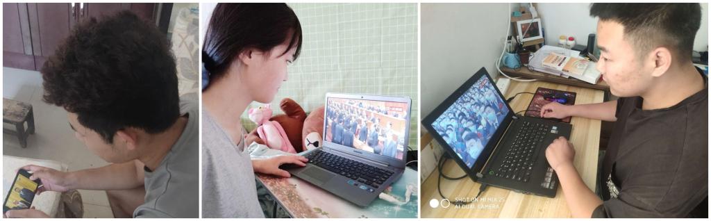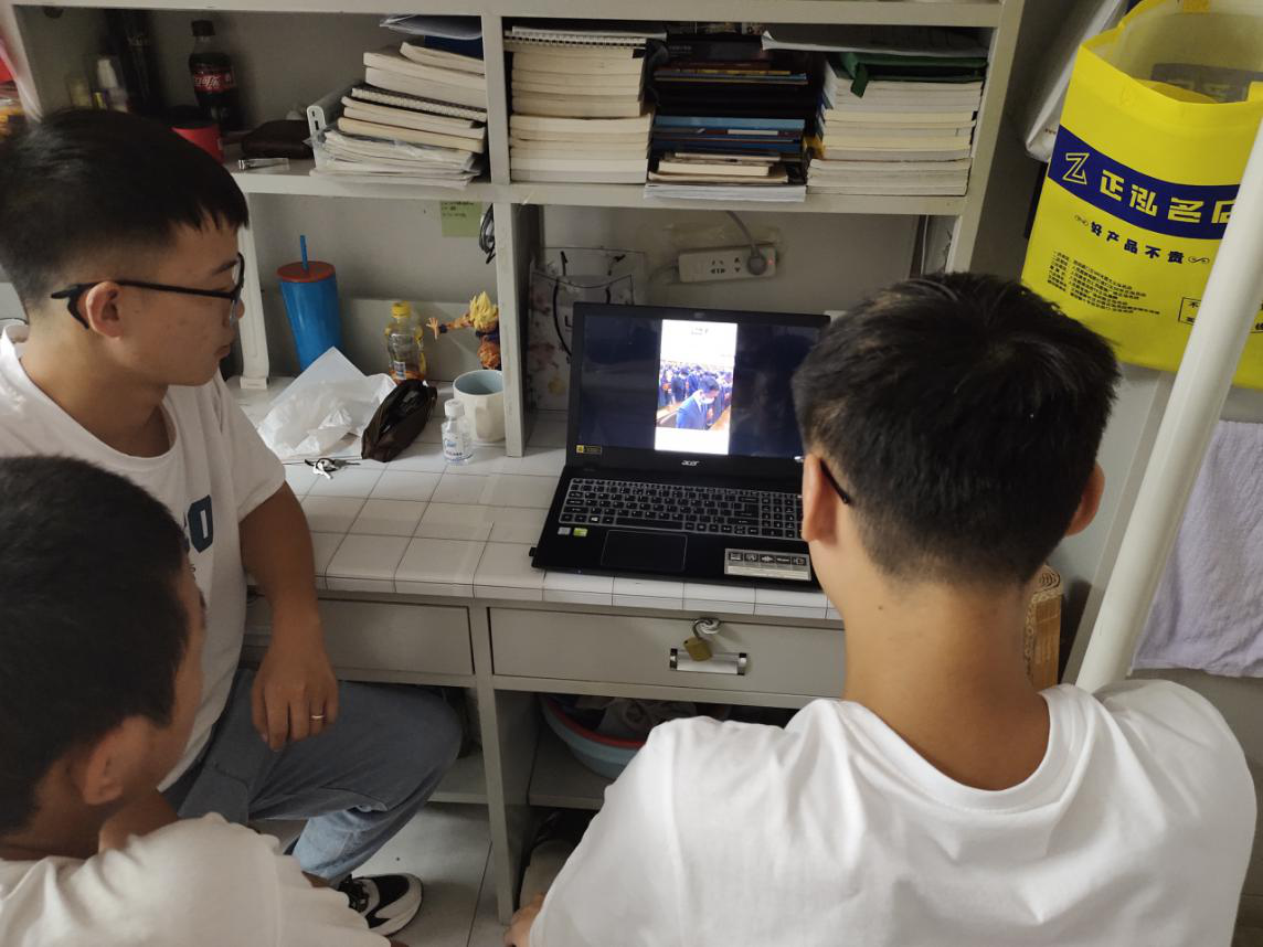 大会开始时,同学们起立高唱国歌。国歌唱毕,全场肃立,向新冠肺炎疫情牺牲烈士和逝世同胞默哀。当习近平总书记为国家勋章和国家荣誉称号获得者颁授勋章奖章时,现场响起热烈掌声,深切表达了同学们对钟南山、张伯礼、张定宇、陈薇等人的敬意。表彰大会最后,习近平总书记发表了重要讲话,同学们认真聆听学习,并做笔记。