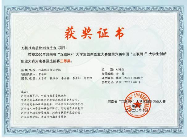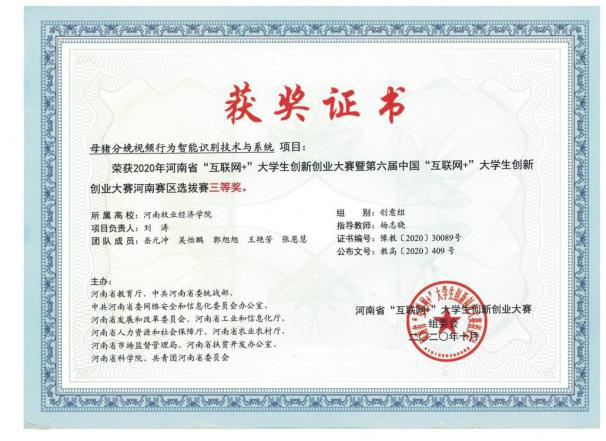三等奖:《母猪分娩视频行为智能识别技术与系统》、《无损性肉质检测云平台》、《新型节能环保冷鲜配送箱》、《智能养殖方案解决提供商》