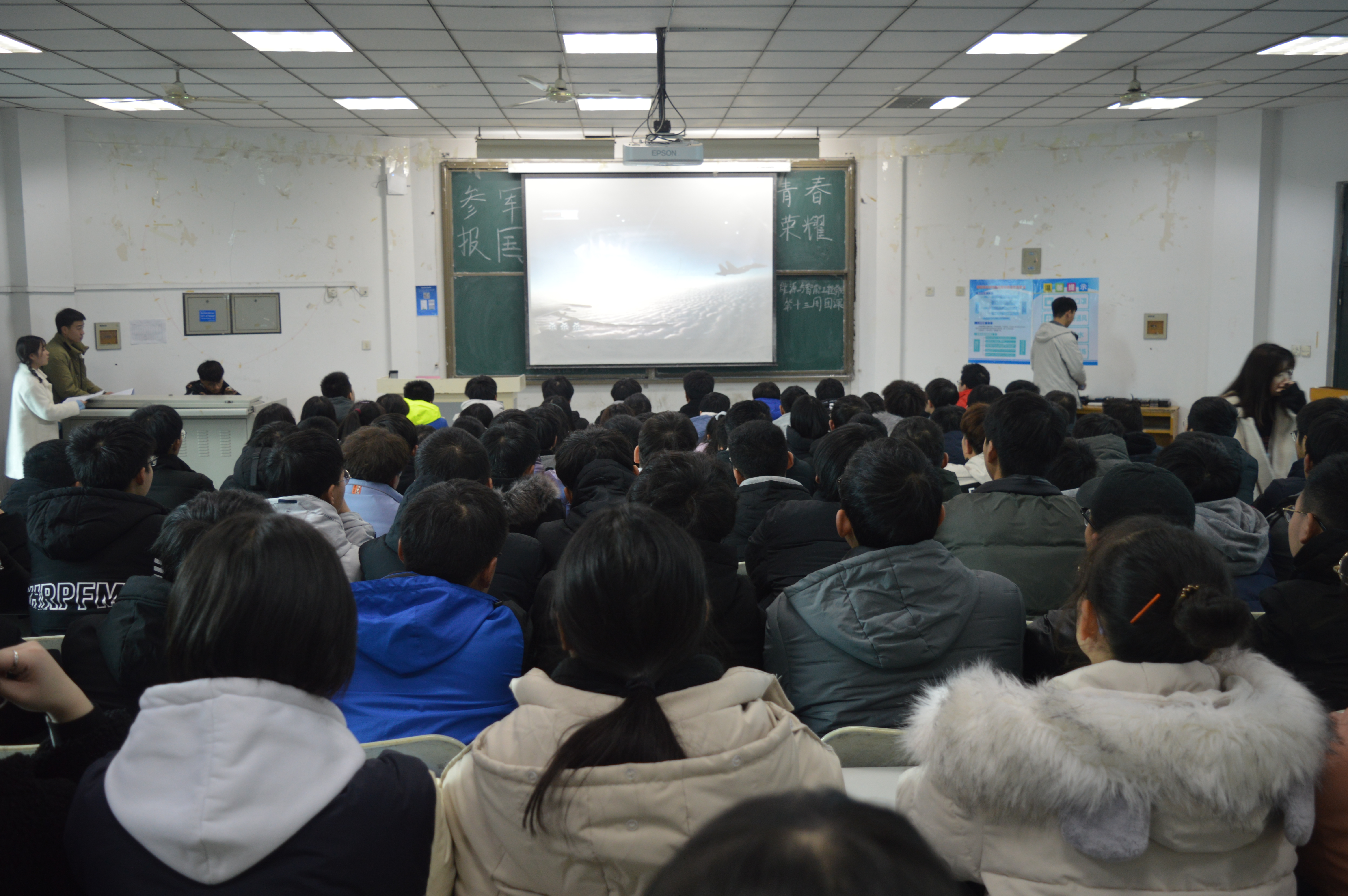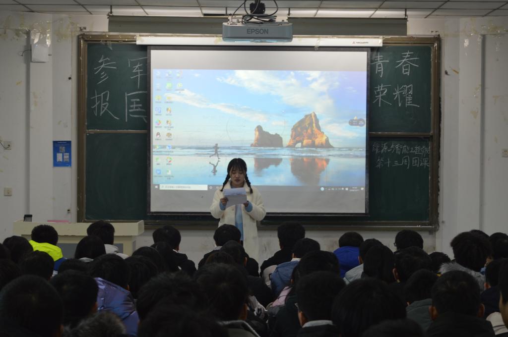 首先,大家观看了国军网征兵宣传视频,视频中把中国军人在祖国社会主义建设事业中勤劳勇敢、吃苦耐劳、不怕困难的品质体现得淋漓尽致,同学们从心中升起对他们由衷的敬佩之情。随后,团支书组织班级节目依次上台表演,演讲、朗诵、诗歌等形式多样。其中20机器人01班宋铮同学演讲的《参军报国 青春无悔》向我们传达了他对参军的渴望:人就像是一只远航的小船,漂泊在广袤的大海上。要想胜利地到达理想的港湾,必须经得起无数次的风浪,还必须有盏不灭的灯塔,指引着前进的航向。无数次的风浪便是人生道路上的无数个坎坎坷坷;那盏不灭的灯塔是人心中执着追求的目标。指引着他前进的那盏灯塔是他对绿色军营的向往,以及献身军营的志向和理想。最后,各班团支书强调,新一代青年员工,有义务亦有担当,身负责任与使命,为国为民砥砺前行。
