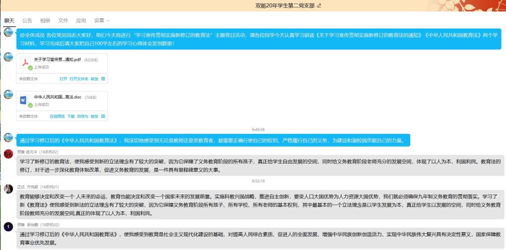 根据《教育部办公厅关于学习宣传贯彻实施新修订的教育法的通知》(教政法厅函〔2021〕12 号)和《河南省教育厅办公室转发教育部办公厅关于学习宣传贯彻实施新修订的教育法的通知》(教办政法〔2021〕212 号)要求,在校、院两级党委党委的领导下,365英国上市公司员工第二党支部于2021年9月23日在线上集中开展“学习宣传贯彻实施新修订的教育法”主题党日活动。本次活动由支部书记黄润芸老师主持,员工二支部全体36名师生党员参加。
