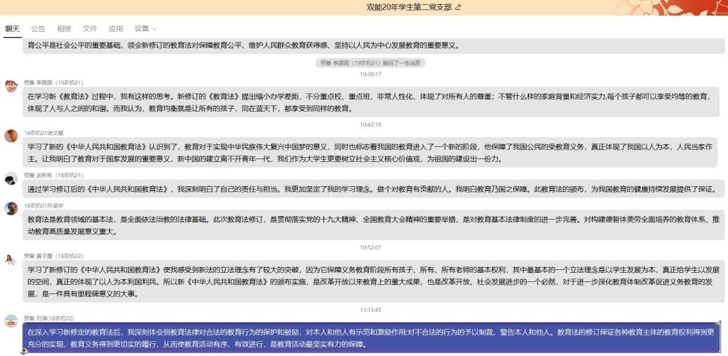 在学习过程中全体支部成员纷纷发表了感想,18农机02黄子露表示:“这次《教育法》的修订,就是将习近平总书记关于教育的重要论述转化为法律的刚性约束和制度规范,对全面推进依法治教具有重大意义,同时充分发挥法治固根本、稳预期、利长远的重要作用,在法治轨道上推进教育治理体系和治理能力现代化。”