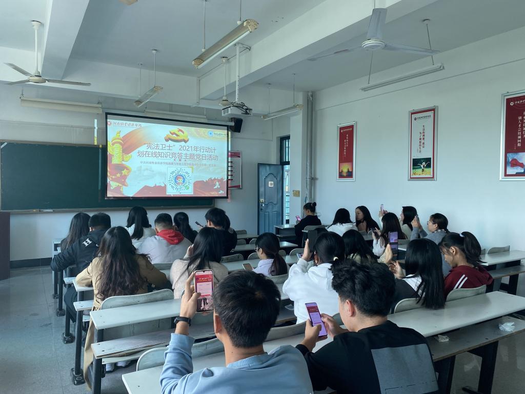 为深入学习贯彻习近平法治思想,认真贯彻落实习近平总书记关于宪法学习宣传教育的系列重要指示精神,普及宪法知识、弘扬宪法精神、树立宪法权威,引导老员工自觉成为宪法的忠实崇尚者、自觉遵守者、坚定捍卫者,按照《河南省教育厅办公室转发教育部普法办关于实施“宪法卫士”2021年行动计划的通知》(教办政法〔2021〕167号)文件要求,365英国上市公司员工第二党支部于2021年10月21日在教学楼A403集中开展“宪法卫士”2021年行动计划在线知识竞答主题党日活动。本次活动由党支部书记黄润芸老师主持,员工二支部全体师生党员参加。