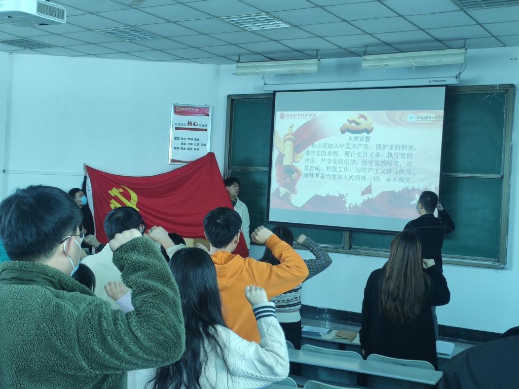 大会开始,全体起立,奏唱国歌,之后王婧宇同志宣布了本次大会拟接收预备党员名单。发展对象们逐一宣读《入党志愿书》,并向党组织汇报自身对党的认识、入党动机、个人经历以及在校表现等,随后入党介绍人黄润芸同志、王珂同志向大会逐一介绍发展对象的主要政治思想、学习、工作生活等情况,支部组织委员吴彦生同志向大会报告发展对象的现实表现的考察情况以及综合政治审查情况,与会党员对发展对象是否符合党员条件发表了意见。大会认为沈文鹏等18名同志基本符合党员条件,经与会正式党员投票表决,大会一致同意接收沈文鹏等18名同志成为中共预备党员。随后,沈文鹏等18名预备党员面对党旗进行庄严宣誓。同时也向大会表达了自身的想法与决心,不忘初心跟党走,在今后的学习工作中,坚定目标、严格要求自身。最后,支部书记黄润芸对本次接收的18名预备党员提出了要求,督促他们在日常的学习、工作、生活中发挥好党员的模范带头作用。
