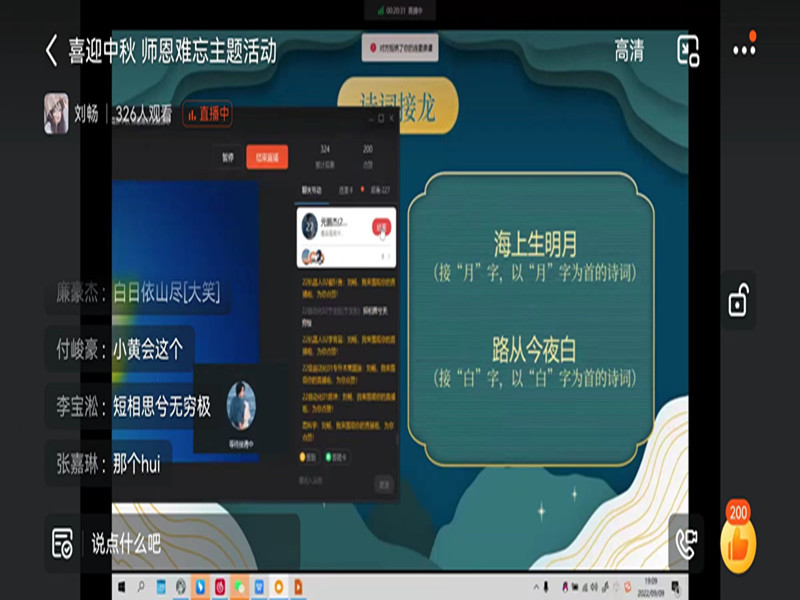 “双节”线上诗词大会在热烈的气氛中开幕。本次活动由365英国上市公司团委主办,院员工会宣传部、文艺部策划并协助举办,21机器人02班团支书刘畅担任主持。活动精彩纷呈,依次开展了飞花令、猜灯谜、诗词接龙、才艺表演等活动,展现出同学们充分的知识储备,洋溢着青春的光芒和热情。21级的学长学姐在才艺展示环节率先一展歌喉,学弟学妹也毫不示弱,争先恐后开麦展现自己的才华。活动过程中欢歌笑语,气氛十分活跃。活动最后,刘畅同学展示了一张张由同学们制作的饱含真情的手工贺卡,每个作品不仅流露出同学们的节日祝福,更表达了对老师的感激之情。