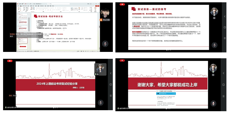 会上,各位学长学姐结合自身考研历程,向学弟学妹们分享考研成功上岸的经验。从复试笔试与面试的介绍、备考规划以及联系意向导师等方面讲述了复试过程及注意事项,帮助同学们更好了解复试的流程。围绕复试流程、英语口语和现阶段如何进行专业课复习、面试基本礼仪等方面进行了详细的说明。活动中,学长学姐们特别强调要有“舍我其谁”的自信去迎接复试,以及在面试与操作时要保持自信大方的态度去应对。