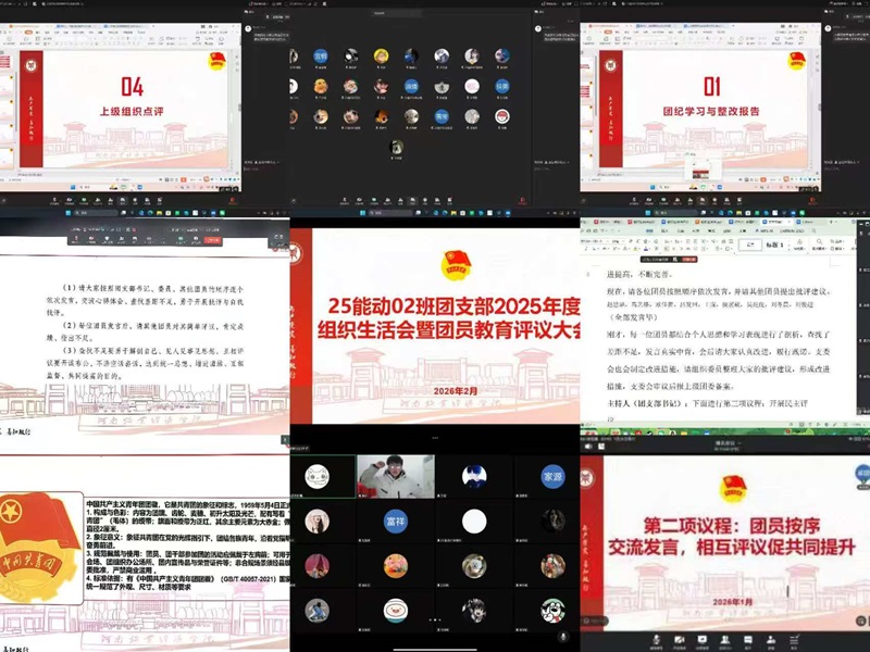 2026年1月29日至2月9日,公司各班团支部以线上方式召开2025年度组织生活会暨团员教育评议大会。本次会议以深入学习贯彻习近平新时代中国特色社会主义思想及党的二十届四中全会精神为核心,紧扣习近平总书记关于青年工作的重要思想,严格对标校团委部署。会议由各班团支书主持,辅导员及全体团员参加。