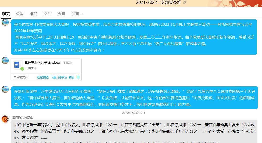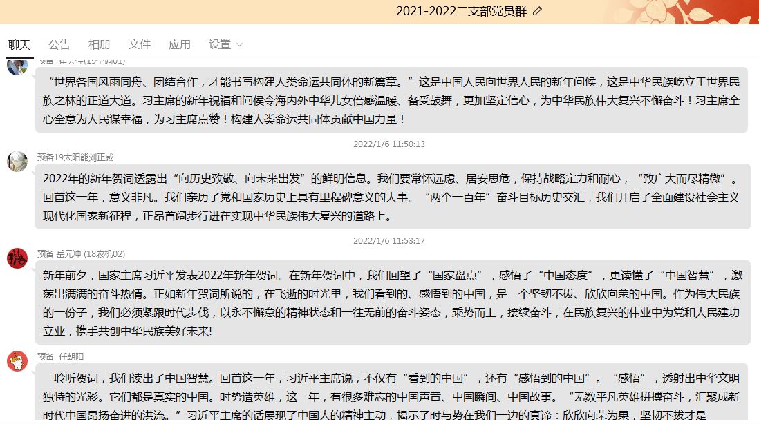 通过学习,同学们纷纷抒发自己的学习感受。席林同志表示:“习近平总书记2022年的新年贺词让我认识到中国共产党不负时代,不负人民的决心和人民对美好生活的向往这一奋斗目标。作为一名党员,我们要坚持高标准、严要求,明白自己所做的实际工作与人民需要之间存在的差距,提高自己在思想觉悟、能力素质、道德修养、作风形象方面的发展,踔厉奋发,笃行不怠,为实现中华民族伟大复兴奋勇前进”。艾永春同志表示:“习近平主席充满希望的话语,展现了中国人民追求团结,共同幸福的崇高理想,表达了中国人民共克时艰、共创未来的坚定决心。‘让大家过上更好生活,我们不能满足于眼前的成绩,还有很长的路要走。’贺词中这句话,是昨天的总结,更是明天的承诺。对于我们新青年来说,我们更要在当下的幸福中以蓬勃的精神去奋斗”。