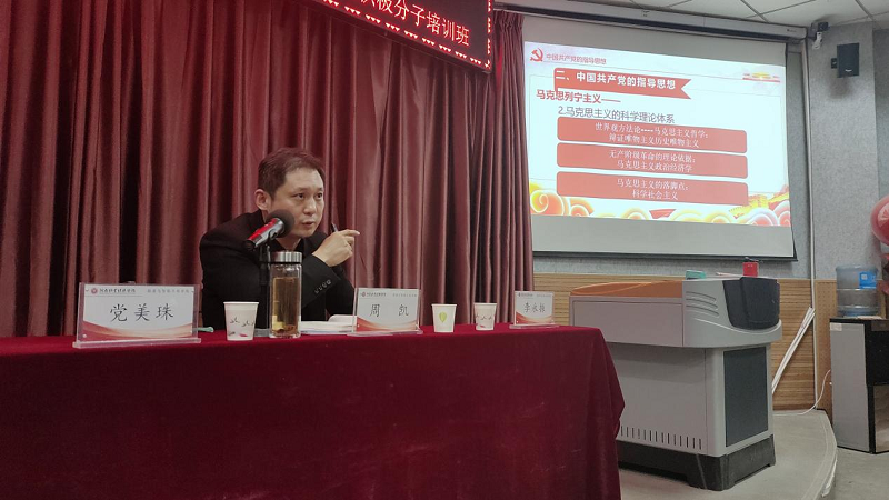 开班典礼结束后,周凯书记做党课的第一讲:《党的指导思想》。周凯结合党的二十大精神,系统全面的介绍了马克思列宁主义思想、毛泽东思想、邓小平理论、‘三个代表’重要思想、科学发展观、习近平新时代中国特色社会主义思想这些一脉相承的党的指导思想。并