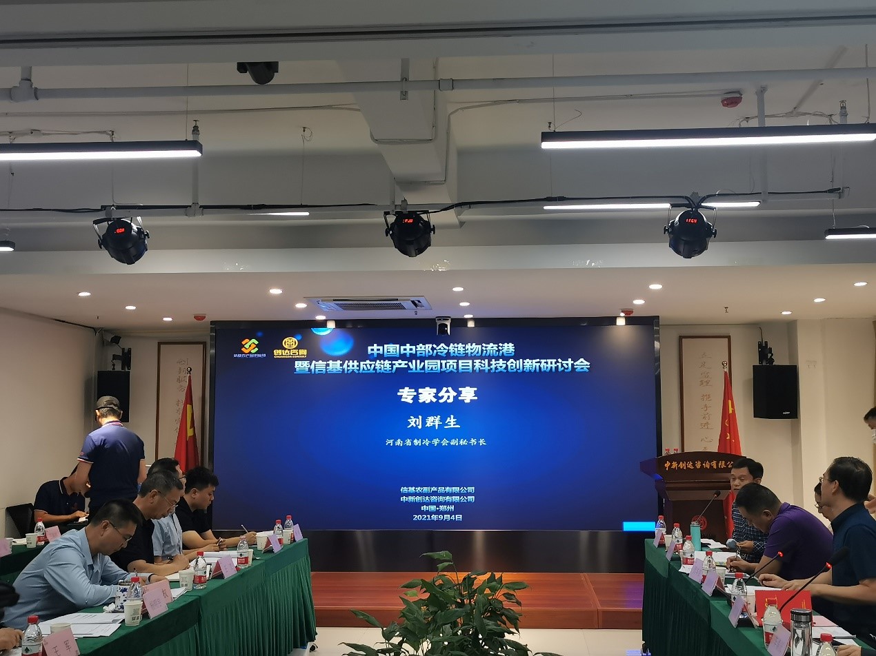 2021年9月4日下午,中国中部冷链物流港暨信基供应链产业园项目科技创新研讨会在郑州市高新区召开,新乡市平原城乡一体化示范区管委会副主任高芳春、中国食品土畜进出口商会冷链流通专业委员会执行理事长江波,河南省肉类协会会长刘承信,信基公司董事长李喜庆以及国内多名行业专家、学者、企业家出席会议。河南省制冷学会作为本次会议的指导单位,贾丰良副理事长、刘群生副秘书长、王军理事参加了会议。