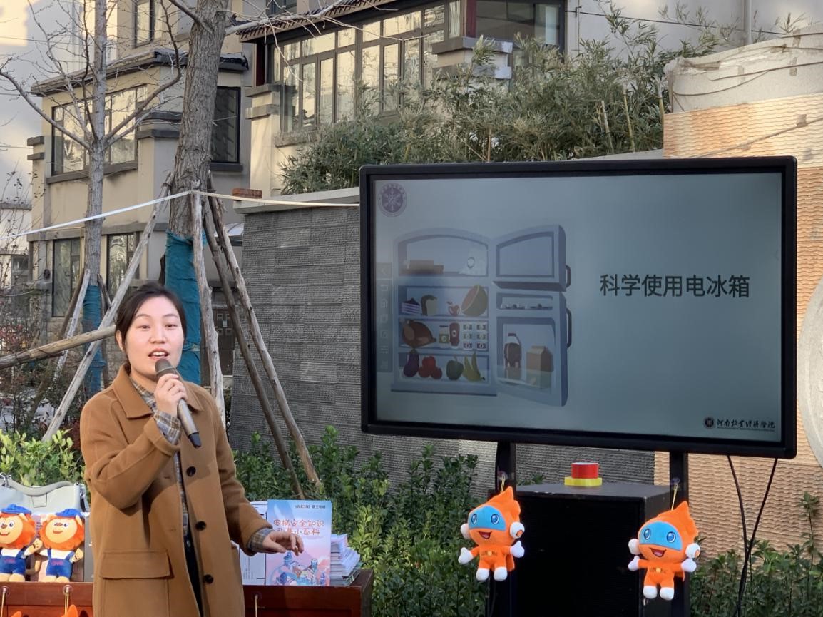 河南省制冷学会科宣部部长段欢欢向现场40多位居民讲解科普知识。以“制冷与健康”为主题从老百姓们生活中常用的家用电器空调器、电冰箱入手,围绕“为什么天气越冷血压越高”、“如何有效保存电冰箱里的食物”、“夏季如何健康使用空调器”、“日常生活中如何防止冻伤”等大家普遍关注的生活常识,用通俗易懂的语言指出冰箱不是什么食品都能存放的保险箱,宣传家用电冰箱、空调器的科普知识,受到了居民的欢迎;制冷专业教师王珂以“科学使用电冰箱”为主题,耐心细致地为社区居民们讲解电冰箱使用注意事项以及电冰箱功能的妙用,建议居民群众家中电冰箱的放置位置要远离灶台、暖气和其它电器;熟食放入电冰箱中最好是先放入加盖的容器中存放,避免交叉感染,电冰箱的使用和空调器的使用类似,也需要定期清洗、除菌、消毒,按周期除霜;最后,电梯销售部区域经理王博向小区居民们进行电梯安全知识的宣传普及。