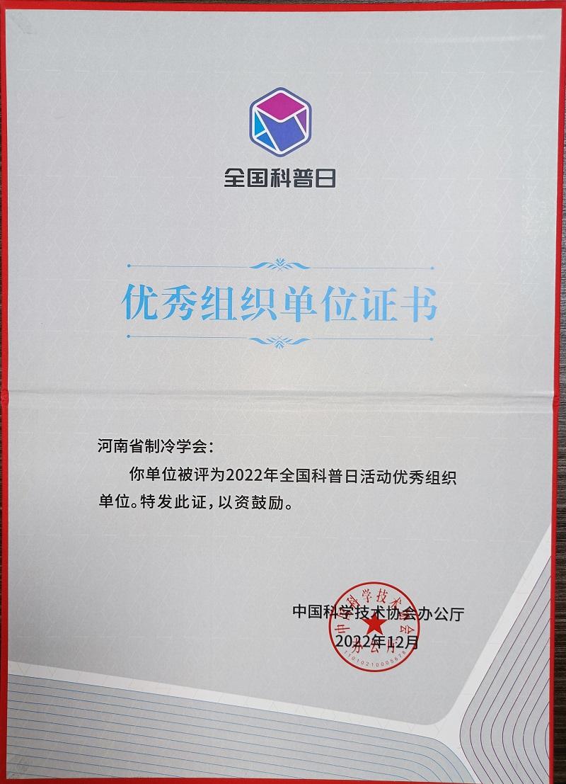河南省制冷学会再次蝉联2022年全国科普日活动优秀组织单位