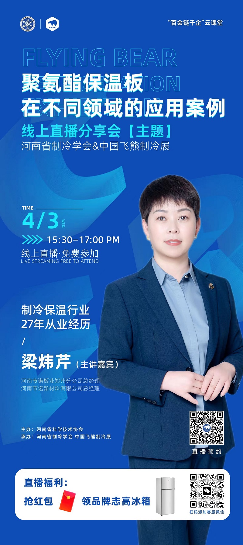 “百会链千企”云课堂第十三期-《聚氨酯保温板在不同领域的应用案例》,学会邀请河南节诺板业郑州分公司总经理、河南节诺新材料有限公司总经理梁炜芹于2024年4月3日(下周三)15:30线上开播。