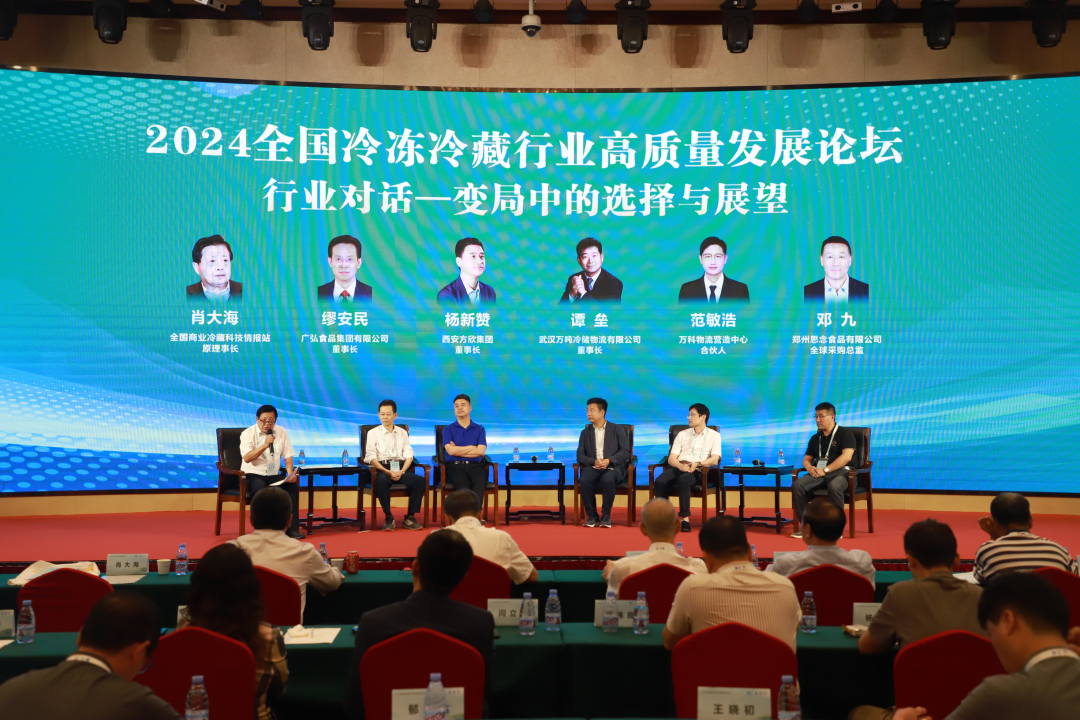 行业对话-变局中的选择与展望环节由中国制冷学会副监事长、国内贸易工程设计研究院院副经理、全国冷藏科技情报站原理事长肖大海教授主持。广东省广弘食品集团有限公司董事长缪安民,西安方欣集团董事长杨新赞,武汉万吨冷储物流有限公司总裁、董事长谭垒,万科物流发展有限公司营造中心中心合伙人范敏浩,郑州思念集团技术指导、全球采购总监邓九作为对话嘉宾,对话嘉宾结合自己企业的发展经历和行业面临的新变化,分享了各自的经验以及应对变化的对策思考和对未来的看法,引发了现场观众的强烈共鸣。
