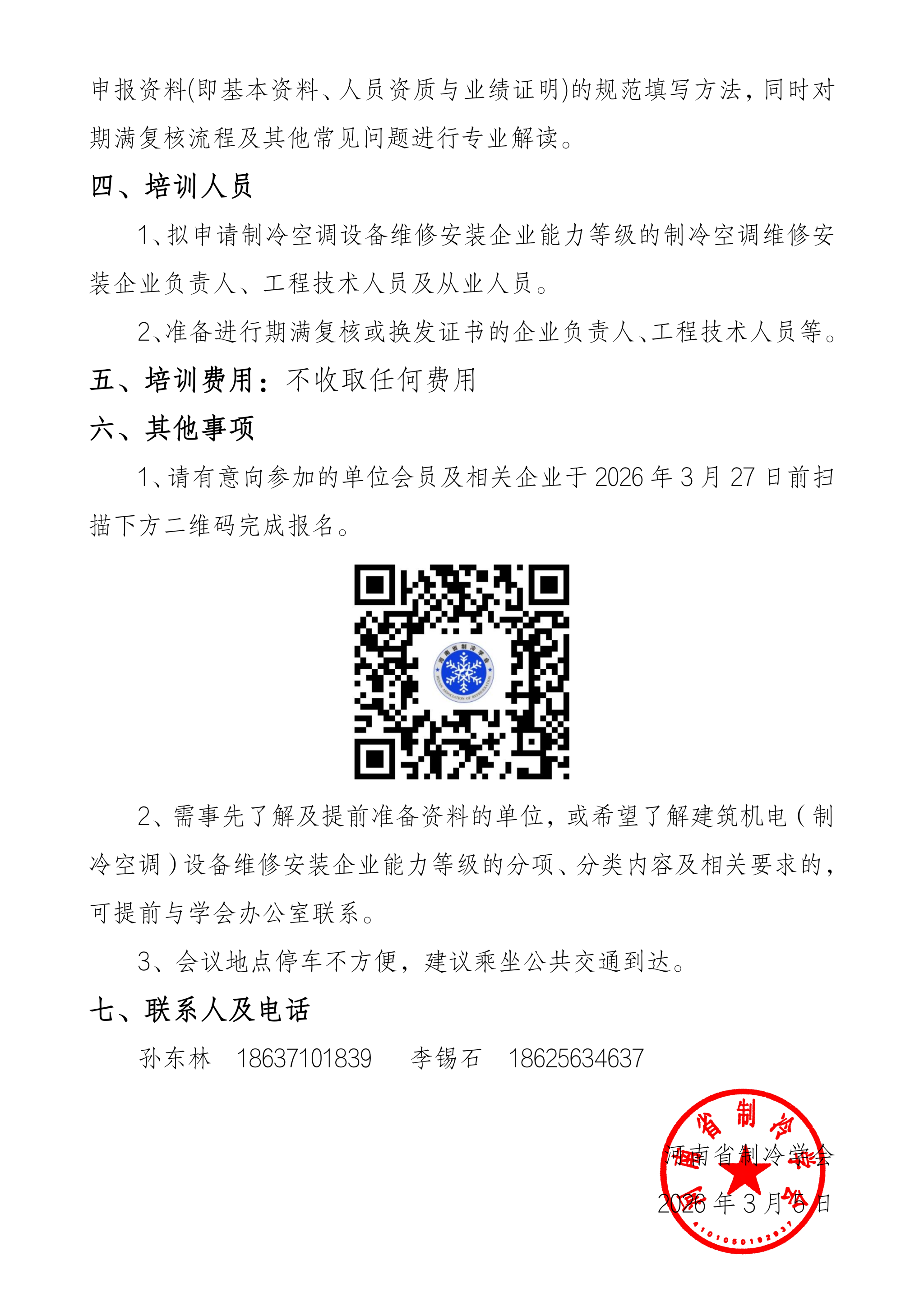关于举办2026年制冷空调设备维修安装企业能力等级培训会的通知