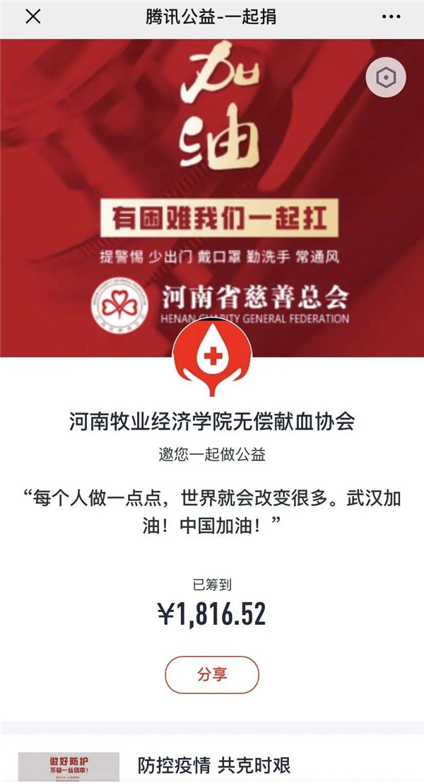 协会于2月15日面向无偿献血协会的全体志愿者们发出了抗击疫情线上捐款活动的倡议,得到员工的积极响应。隔离病毒,不能隔离爱。截至2月25日,向河南省慈善总会的“防控疫情、共克时艰”的专项基金捐款1816元,参与捐赠人数达115人,疫情面前,协会积极行动,捐款数额虽然不大,却承载着浓浓爱意与温情,大家纷纷表示希望聚沙成塔,尽绵薄之力为防控疫情做贡献,为疫情救治奉献自己的力量。