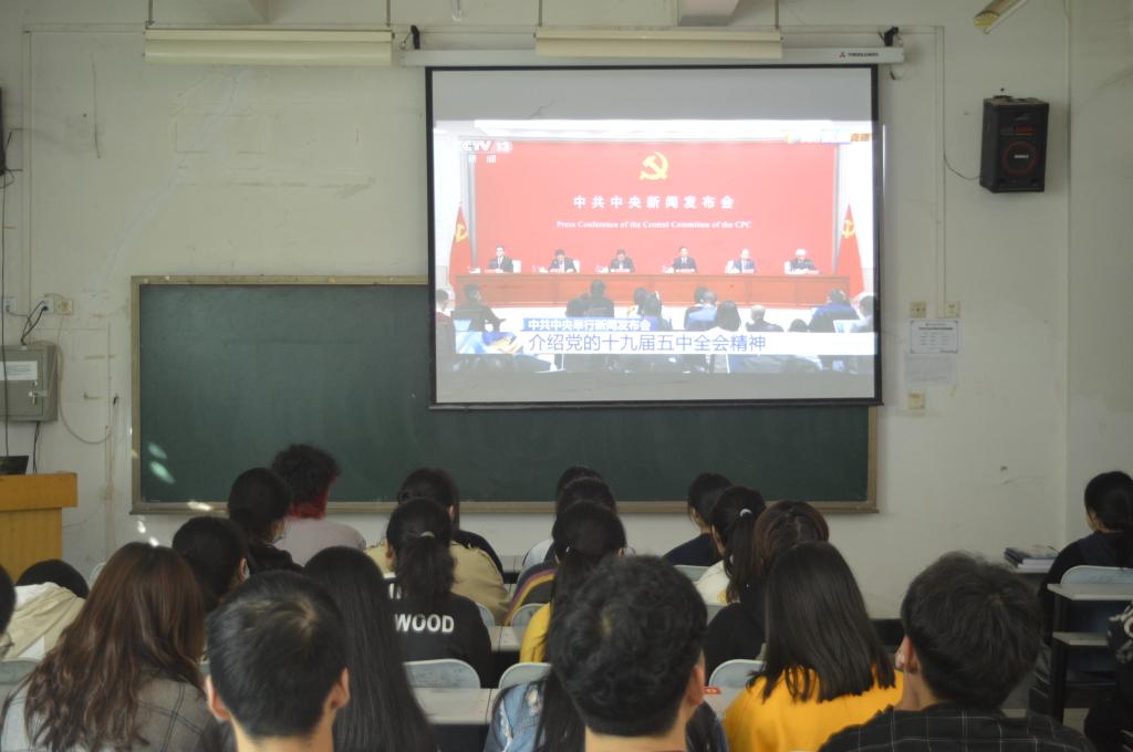 发布会上,中共中央政治局委员、中宣部部长黄坤明在发布会中指出,这次全会是在全面建成小康社会胜利在望、全面建设社会主义现代化国家新征程即将开启的重要历史时刻召开的一次十分重要的会议。告诉大家以习近平同志为核心的党中央谋划未来的远见卓识和继往开来的历史担当,是我国发展的指导方针、目标任务、战略举措,具有重大而深远的意义。会议的内容赢得现场阵阵掌声,同学们纷纷表示要积极认真学习贯彻落实全会精神,坚定制度自信,不断推进国家治理体系和治理能力现代化,沿着党和人民开辟的正确道路,奋力前进。
